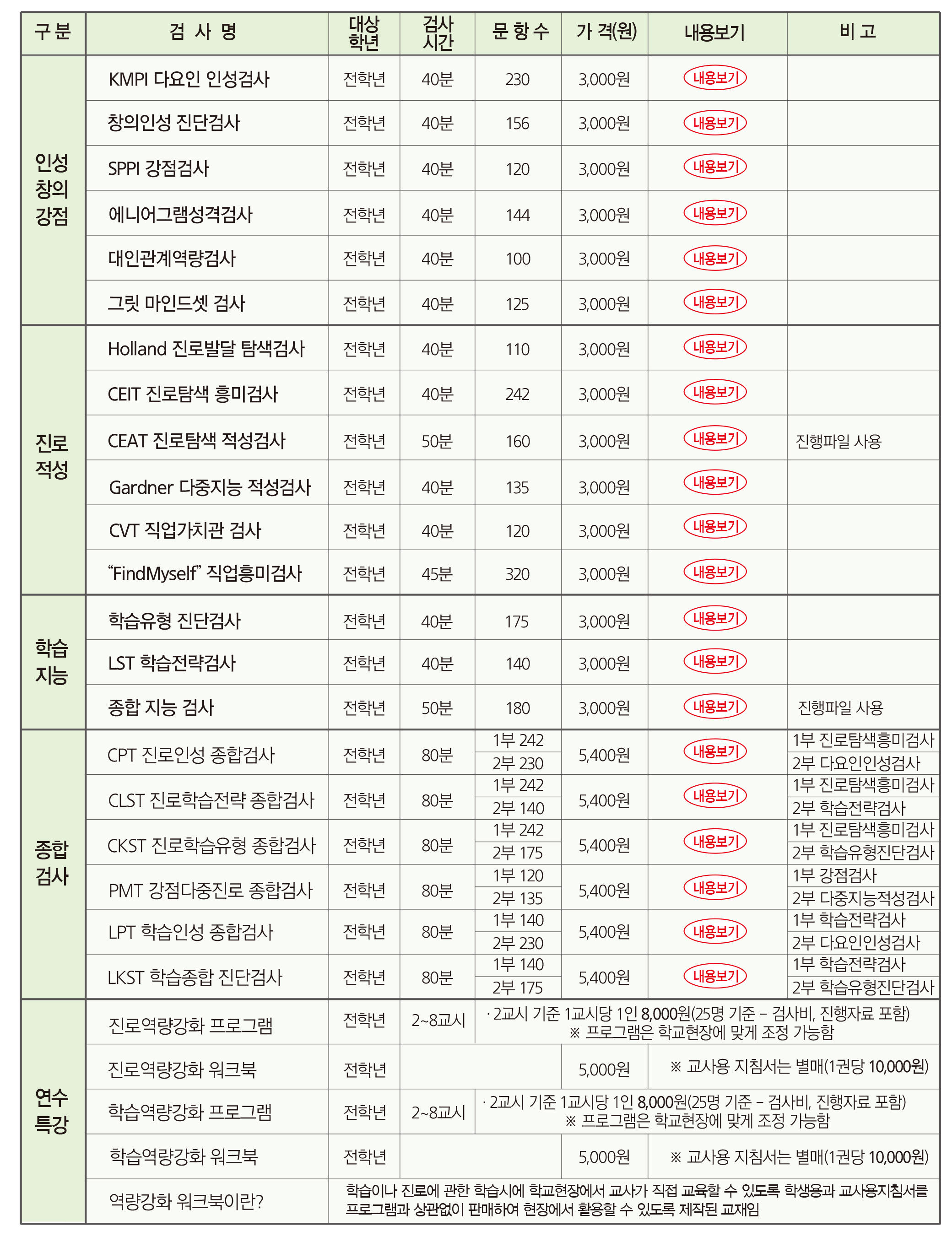 kmpi다요인인성 창의인성 강점검사 에니어그램 대인관계역량 그릿마인드셋 진로발달탐색 진로탐색흥미 진로탐색적성 다중지능 직업가치관 직업흥미검사 학습유형 학습전략 종합지능 진로인성 진로학습전략 진로학습유형 강점다중 학습인성 학습종합